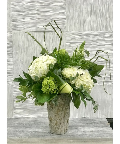 Green and white hydrangea embellished with multiple layers of rich foliages gracefully nestled in a stone vase that looks like bark. A perfect look for any occasion.