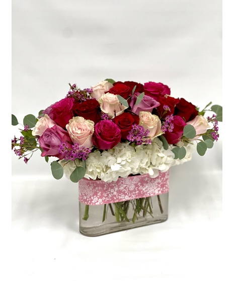A modern design of 24 roses in assorted colors In an oval glass vase accented with wax flower nestled in a bed of hydrangea. Definitely a winner!