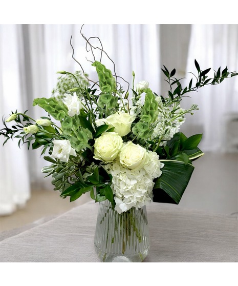 The timeless elegance of pristine white blooms is paired perfectly with a unique variety of our favorite seasonal textures. Designed in a ribbed glass vase.