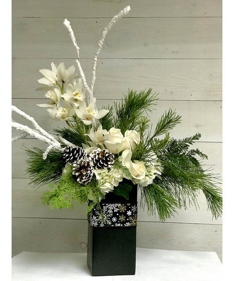 A white holiday arrangement in a sleek black vase. *Flowers included may vary